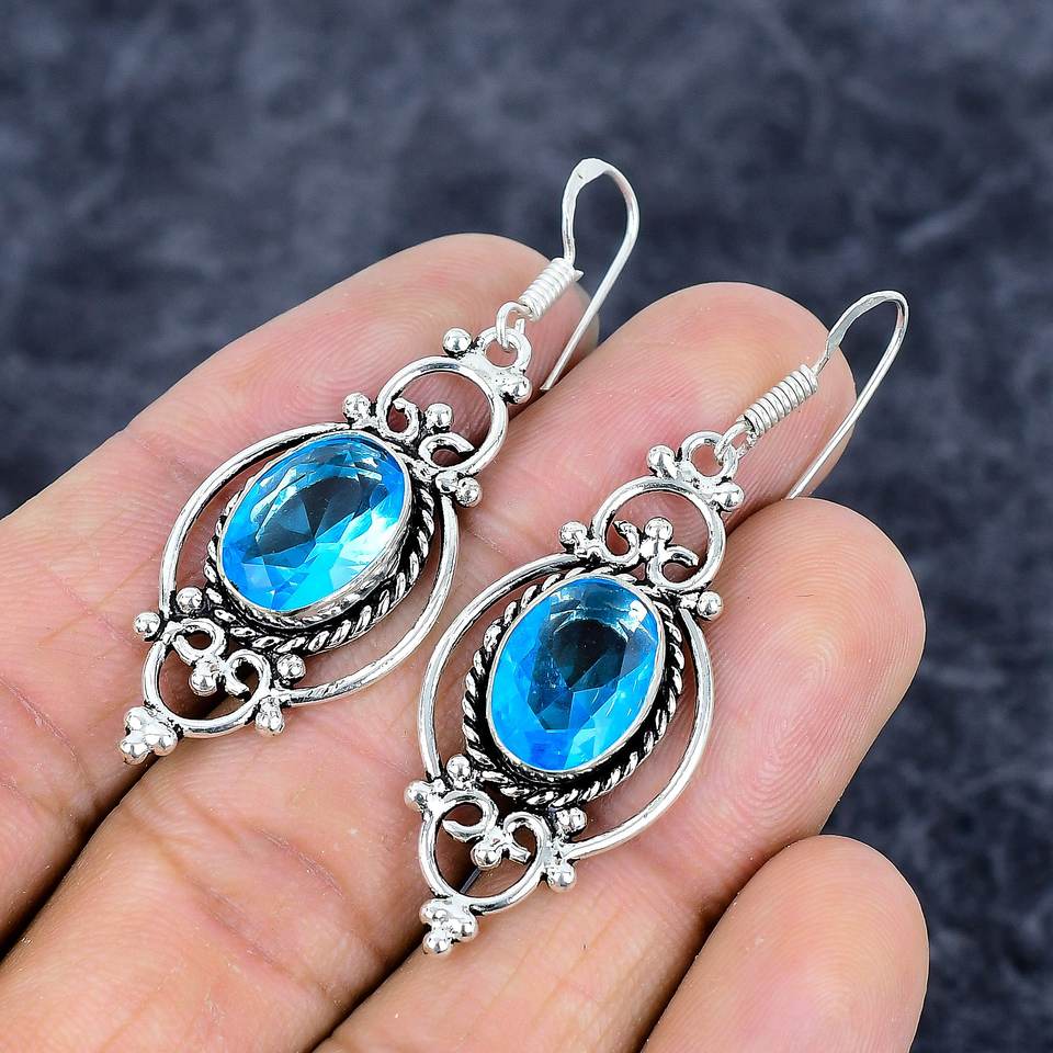 Boucles d'oreilles en argent sterling 925 faites à la main topaze bleue longue goutte forme ovale pierre précieuse or classique pour les mariages fêtes cadeau classique
