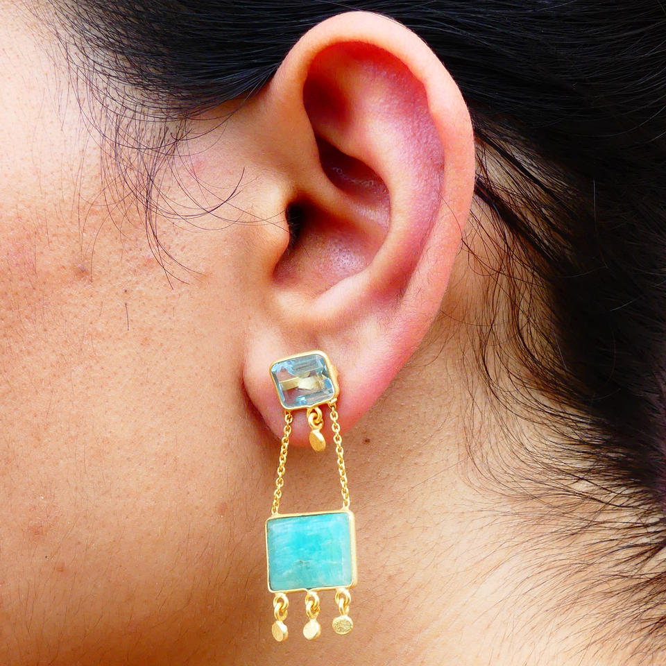 Boucles d'oreilles classiques faites à la main en argent sterling 925 plaqué or avec amazonite et topaze bleue pour femmes