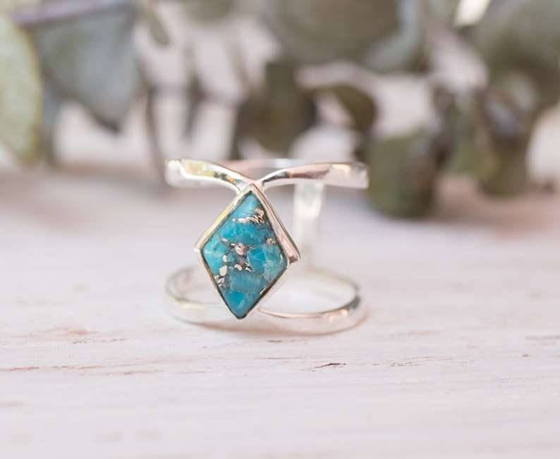 Handmade 925 Sterling Silver Marquise Ring with Turquoise & Diamond Copper & Natural Stone Bezel Setting Inlay for Wedding Party