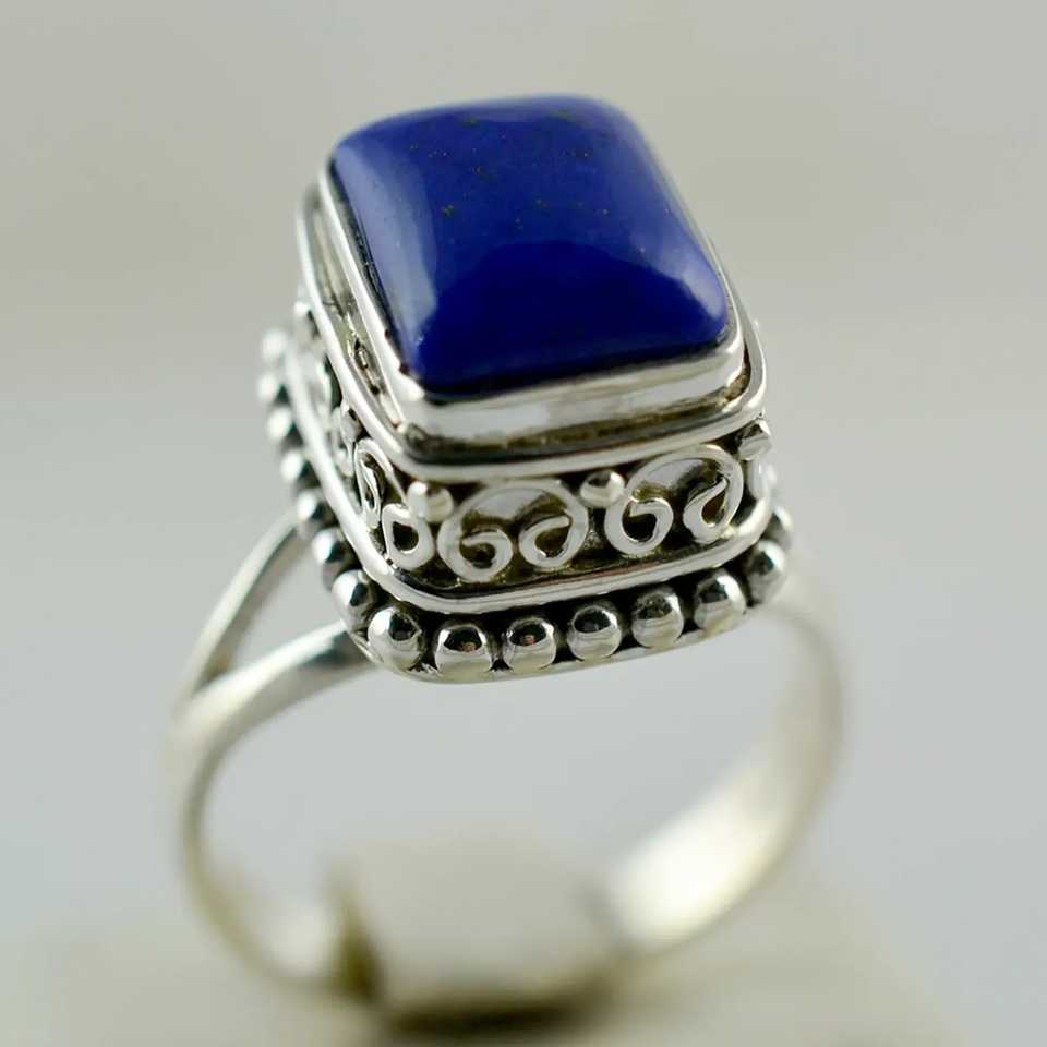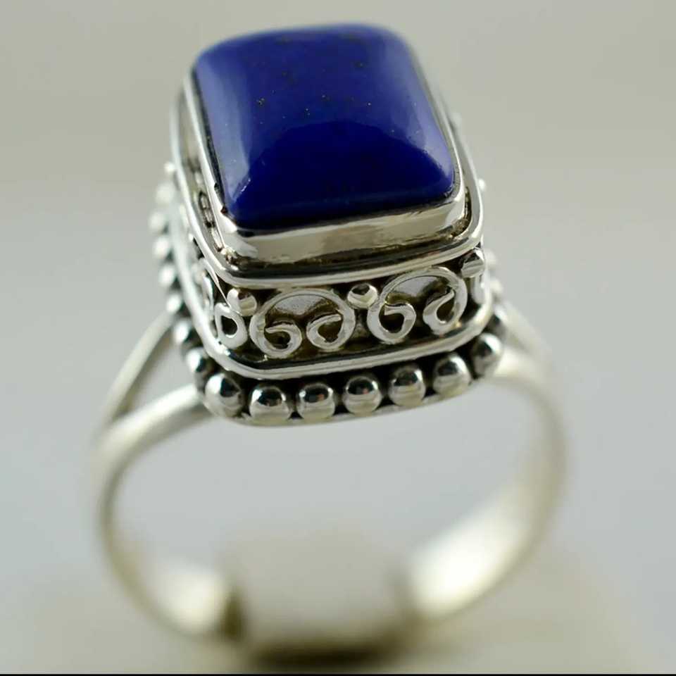 Bague Statement Faite à la Main en Argent Sterling 925 avec Pierre Précieuse Naturelle Lapis Lazuli Bleue en Forme de Coussin, Style Bohème Géométrique, Septembre