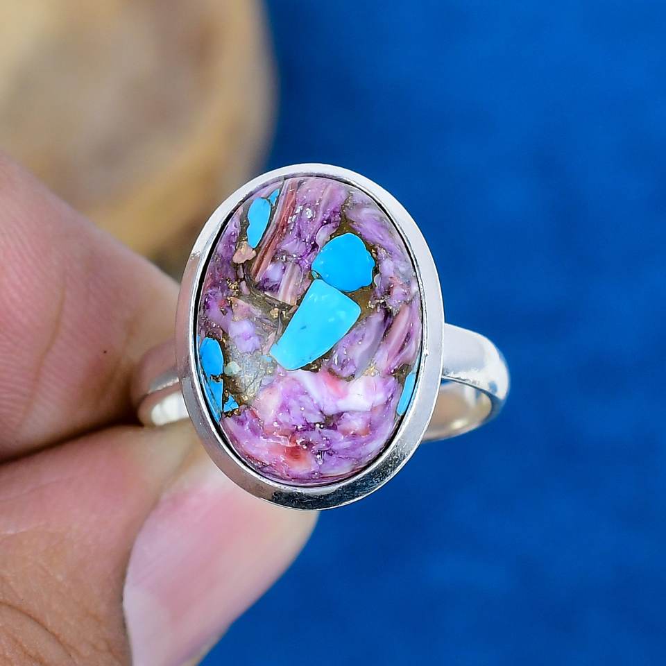 Handmade Natural Spiny Purple Oyster Copper Turquoise Cushion Shape Ring 18k Gold Microne Over 925 Sterling Silver