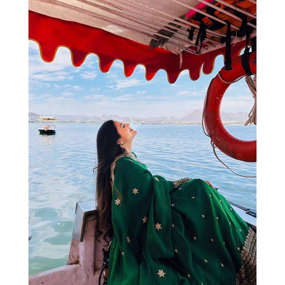 Robe de soirée trapèze faite main avec broderies, pent et dupatta, taille empire, en organza et travail de sequins