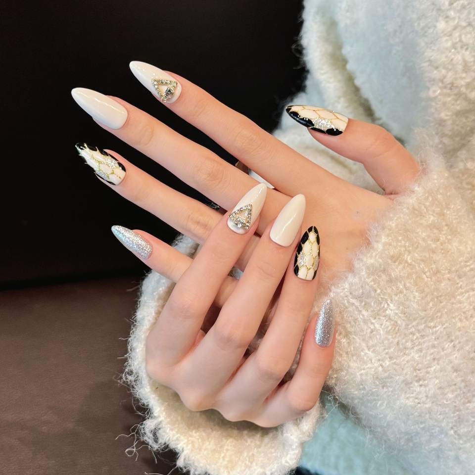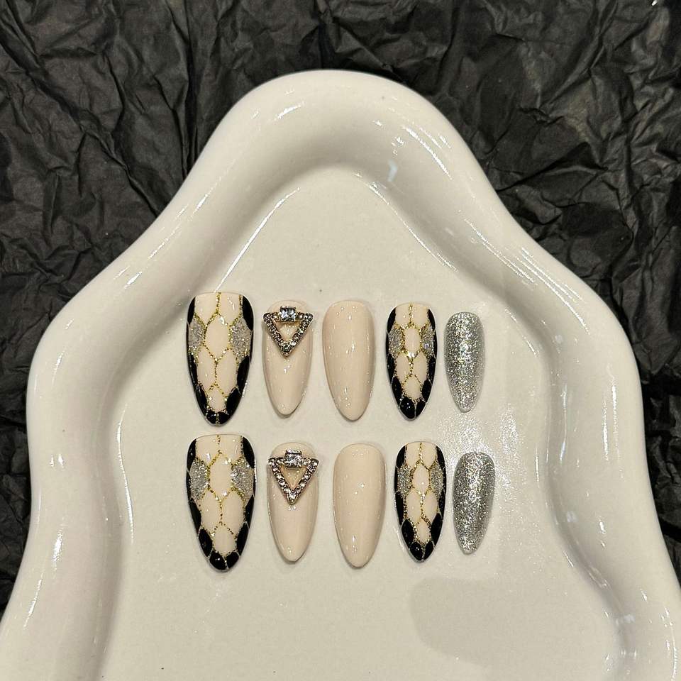 Ongles artificiels à presser en amande faits main, motif tête de serpent Harlequin crème, bijoux serpent 3D doré et art diamanté, ongles de luxe en gros