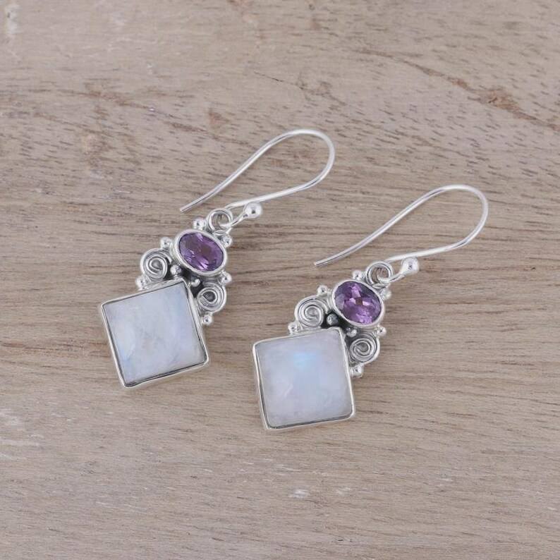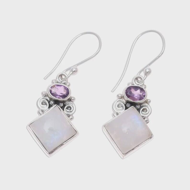 Mot-clé:Boucle d'oreille à clous en améthyste et pierre de lune, ornée de pierres de lune améthyste étincelantes.