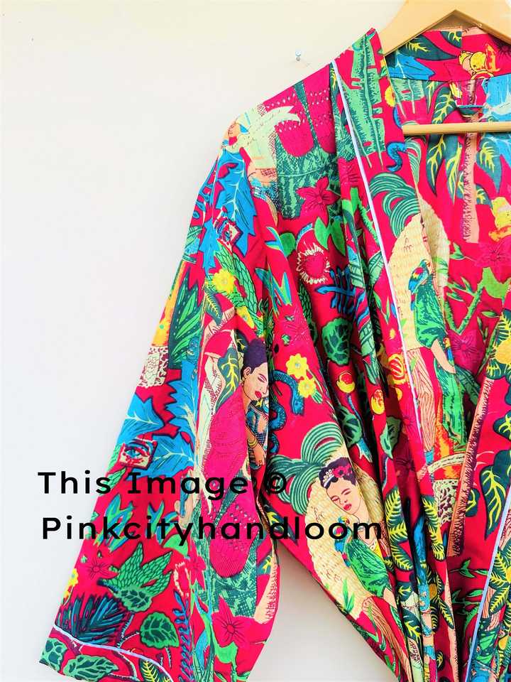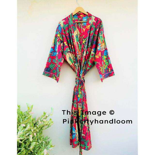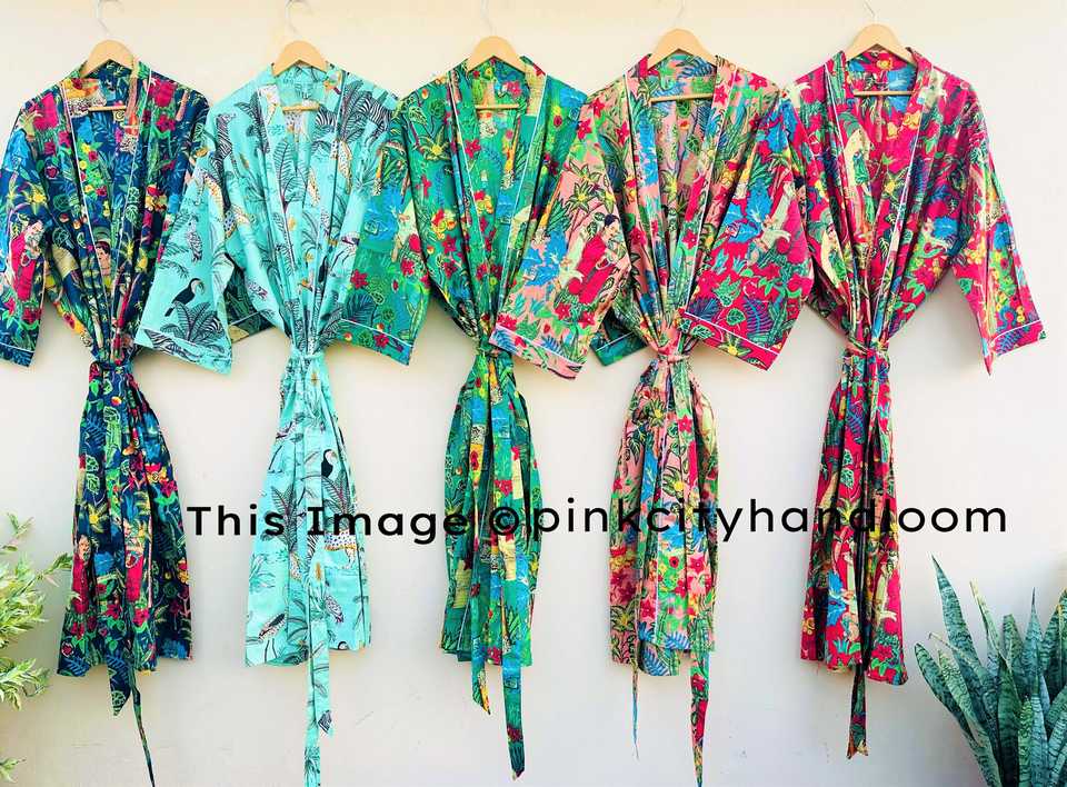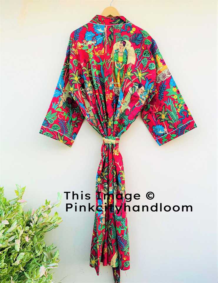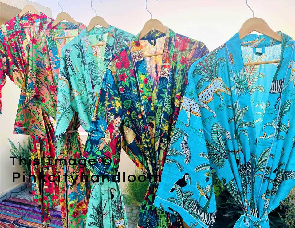 Handmade 100% Natural Cotton Kimono Robes Beach Cover-Up Bathrobe for Women Casual Block Printed Dress