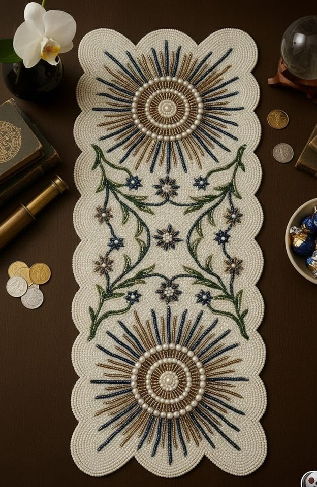 Chemin de table brodé à la main avec perles, unique et festif, avec des motifs en perles de rocaille sur tissu en coton