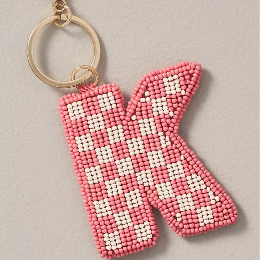 Porte-clés Lettre K Perlé Fait Main Rose et Blanc à Carreaux, Breloque de Sac Personnalisée avec Fermoir Mousqueton Doré, Tendance et Élégant