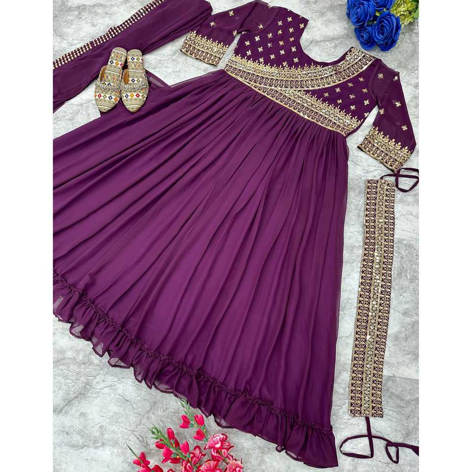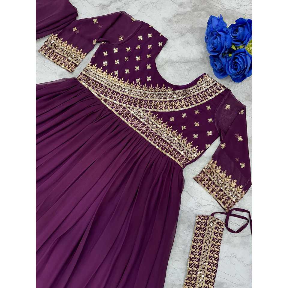 Robe Anarkali A-Line faite à la main, magnifique, en mousseline, avec col rond et taille empire, idéale pour les fêtes, incluant un dupatta et une ceinture.
