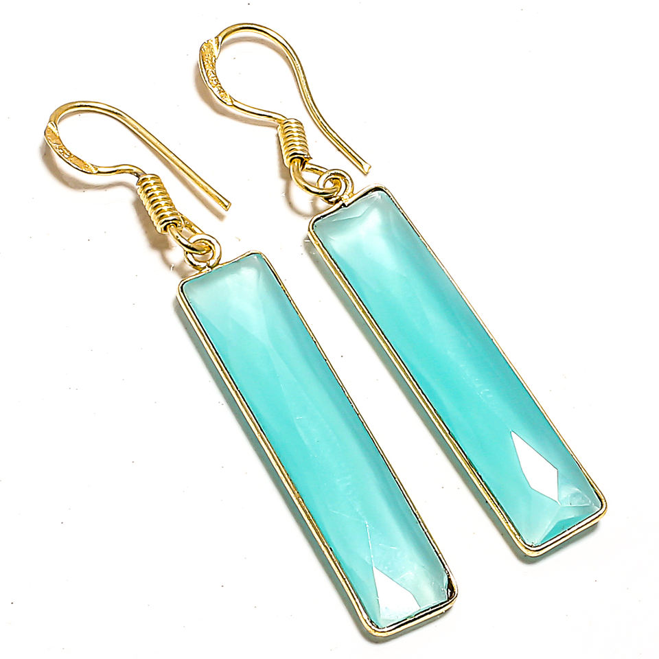 Boucles d'oreilles pendantes en calcédoine bleue faite à la main en forme de rectangle en argent 925 plaqué or cadeau pour femme