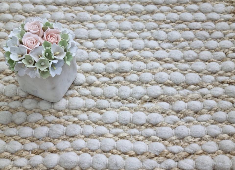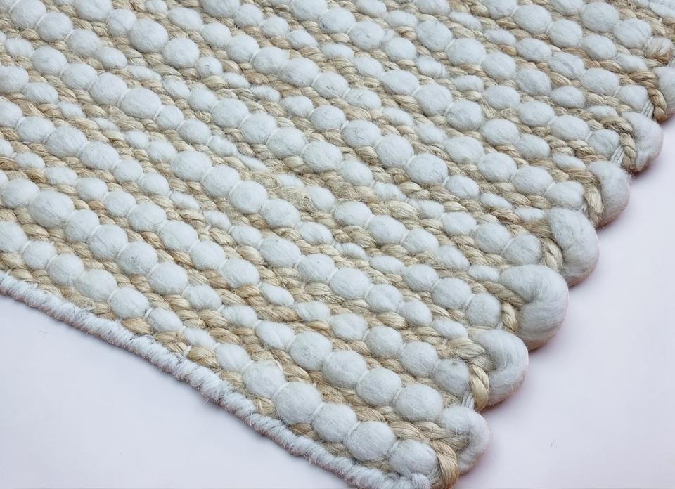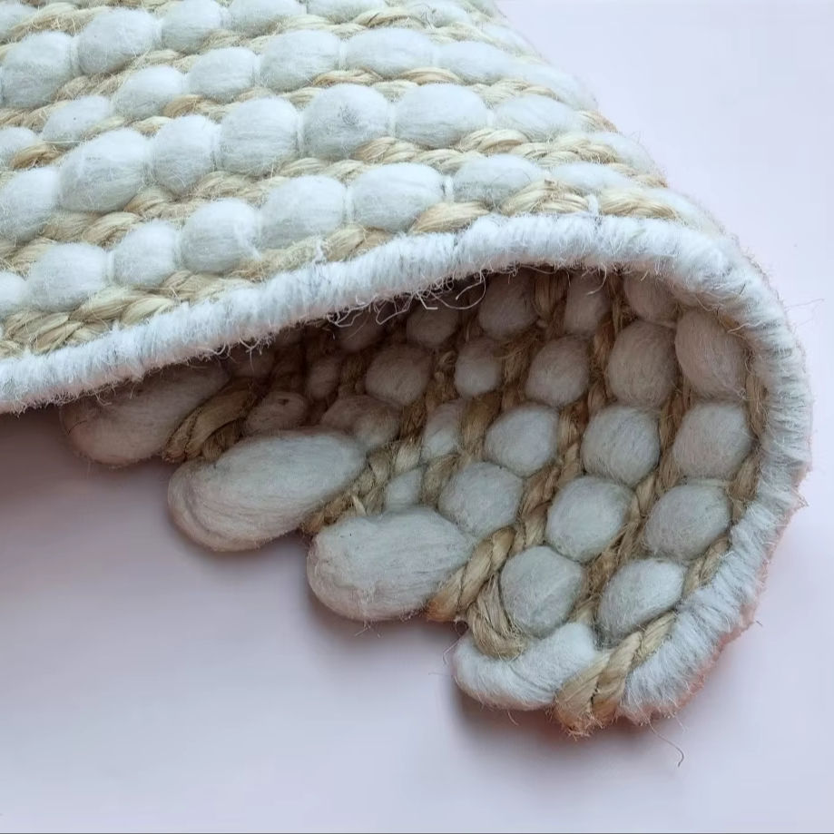 Tapis tufté en laine bleue fait main – Tapis texturé doux à rayures et pompons pour salon, chambre et décoration intérieure