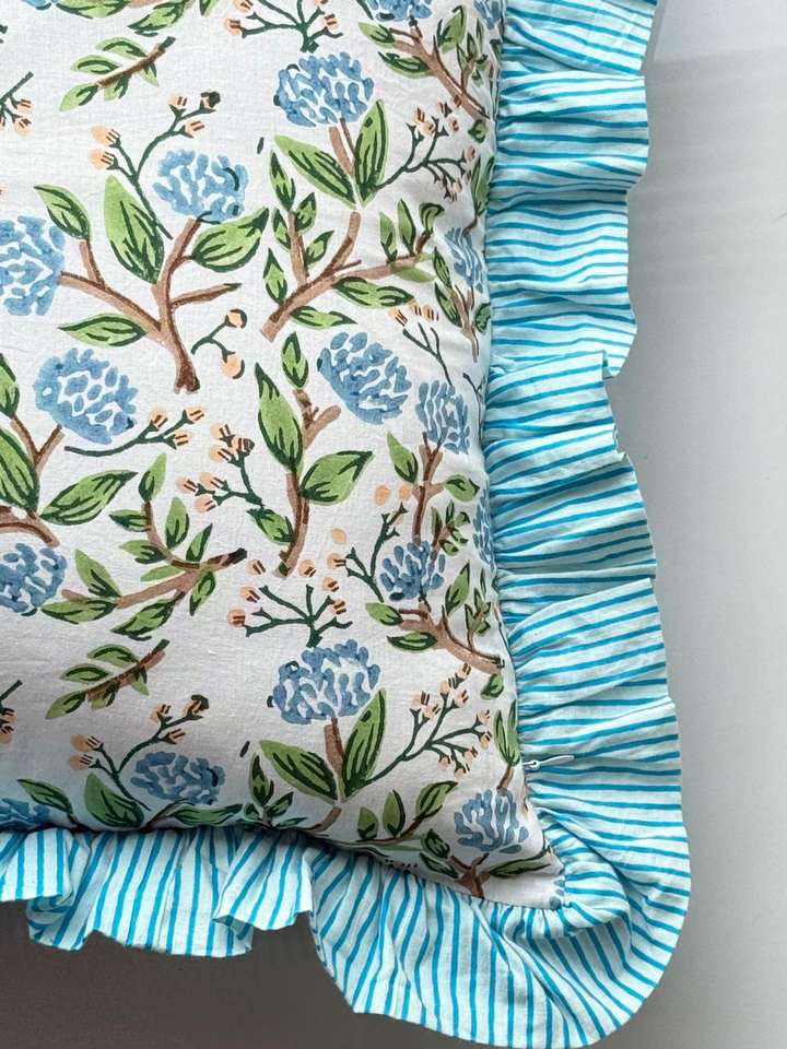 Housse de coussin en coton bohème faite à la main avec imprimé floral en blocs, coussins décoratifs de luxe, coussins bohèmes à volants