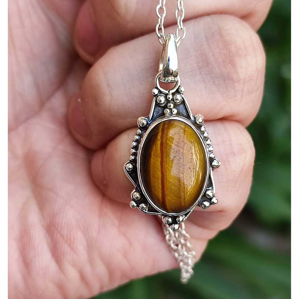 Collier bohème fait main en argent avec pendentif médaillon en argent sterling et perle œil de tigre naturelle, cadeau unique pour elle