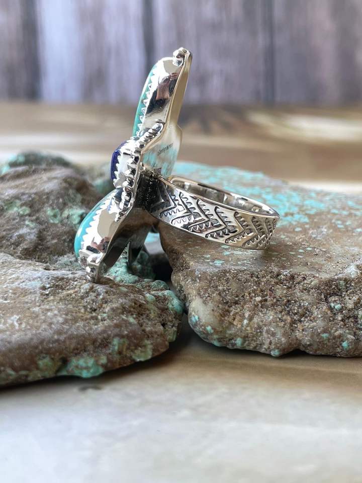 Bague de déclaration Vintage Boho faite à la main réglable en argent Sterling Lapis Turquoise ovale coupe pierre naturelle lunette réglage pour