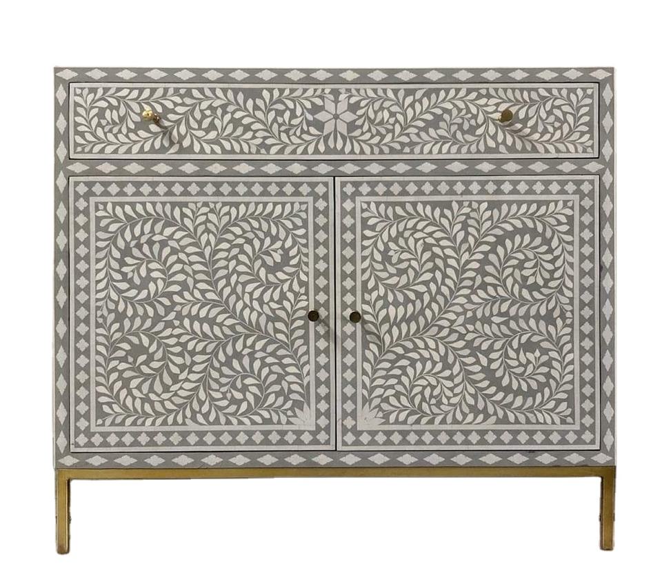 Commode à tiroirs en bois de luxe avec incrustations d'os artisanales et motifs floraux complexes, meuble de rangement pour la décoration de la maison et des hôtels