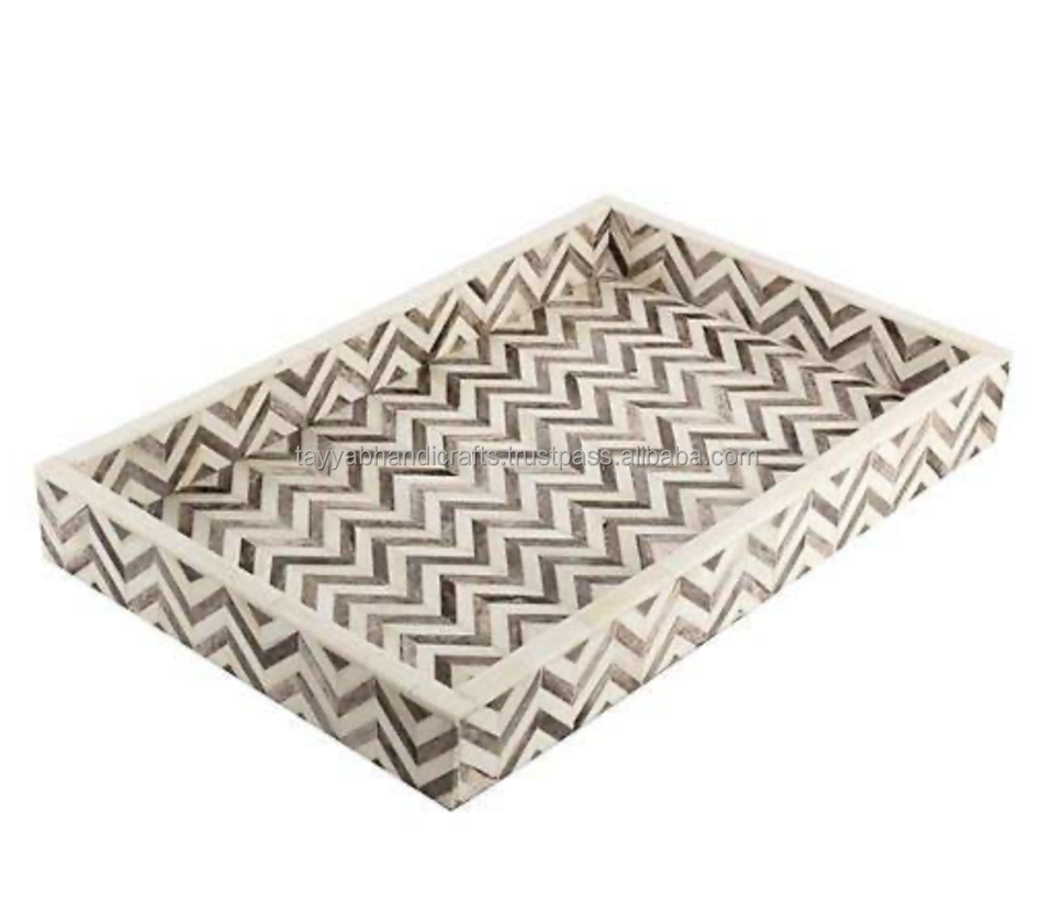 Plateau de service rectangulaire artisanal en bois incrusté, qualité commerciale, compatible lave-vaisselle, motif chevron bleu et blanc classique, MOP