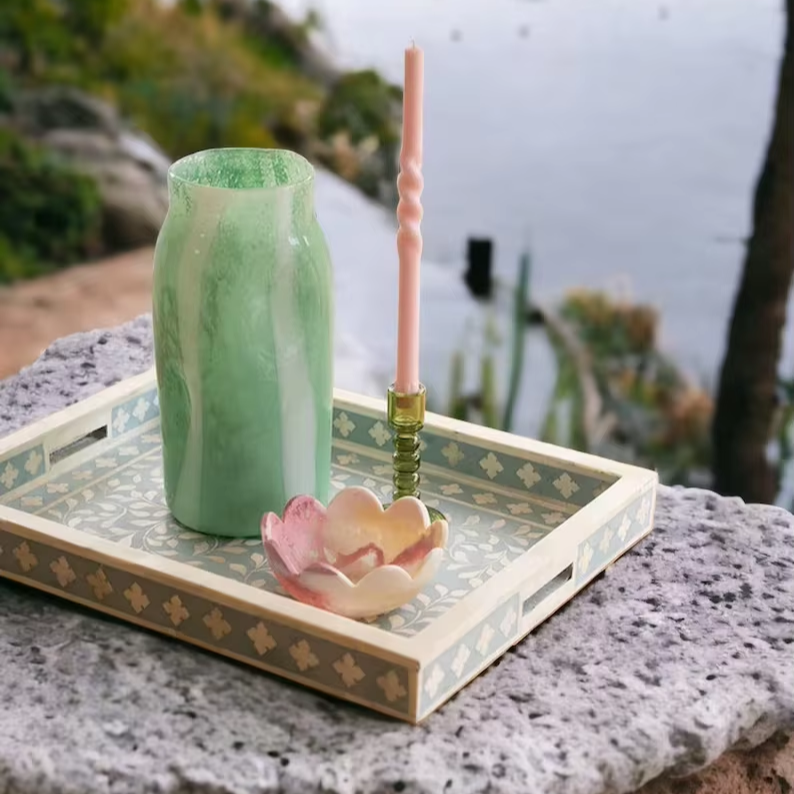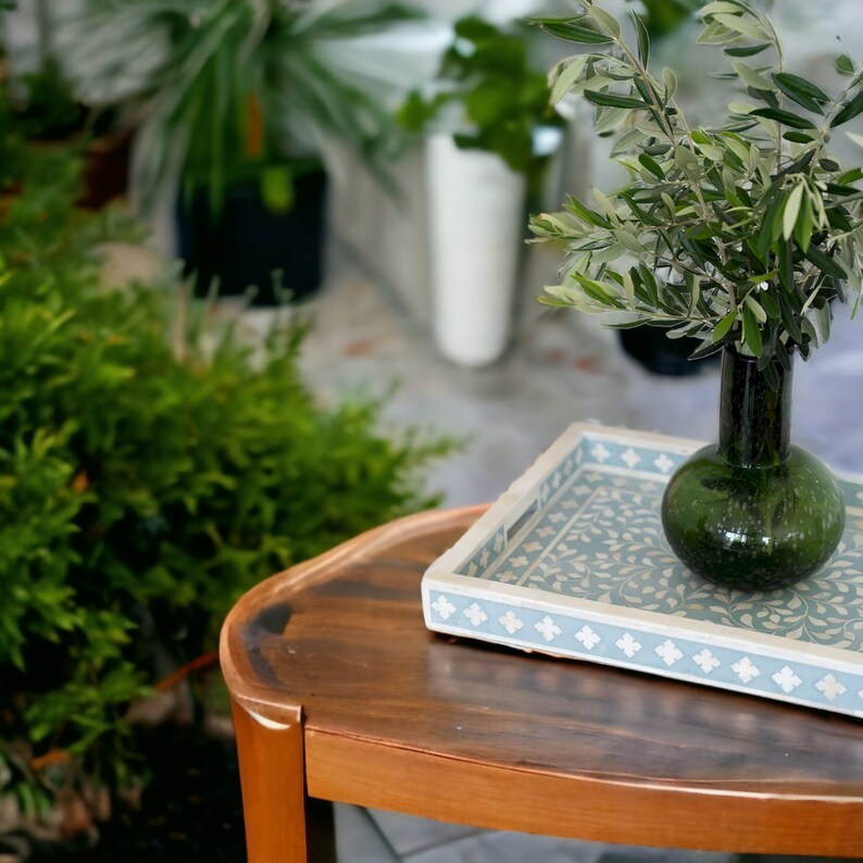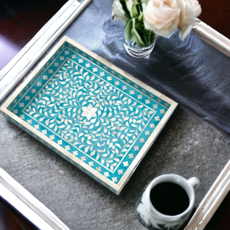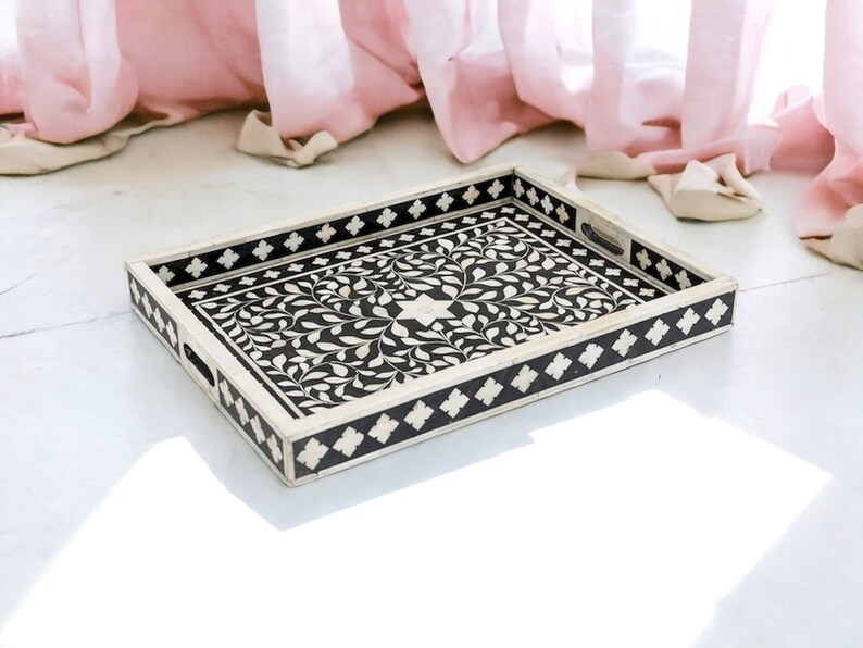 Plateau de service en bois avec incrustation d'os, motif floral moderne, fait main, plateau décoratif en os incrusté, par PERFECT ENTERPRISES
