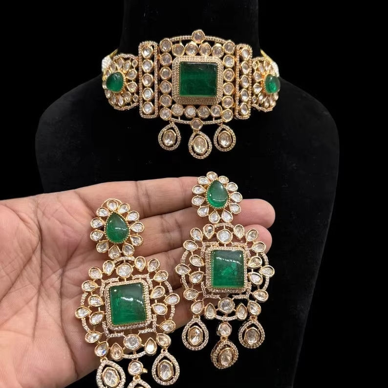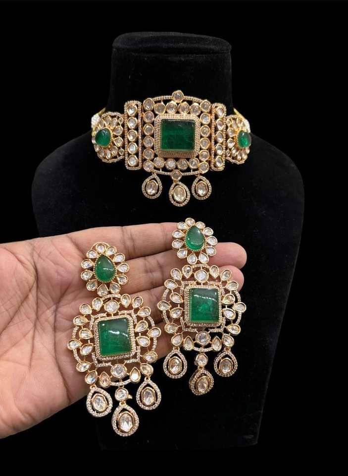 Ensemble Kundan personnalisable en vrac fait à la main, tour de cou de mariée vert, créateur inspiré pour les mariages, les fêtes et les fiançailles