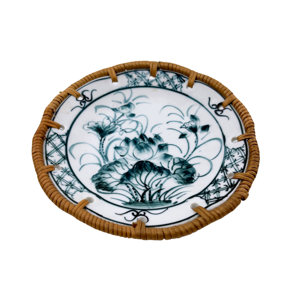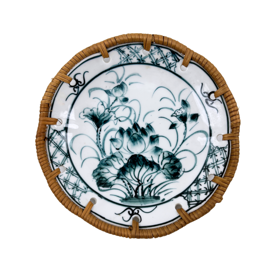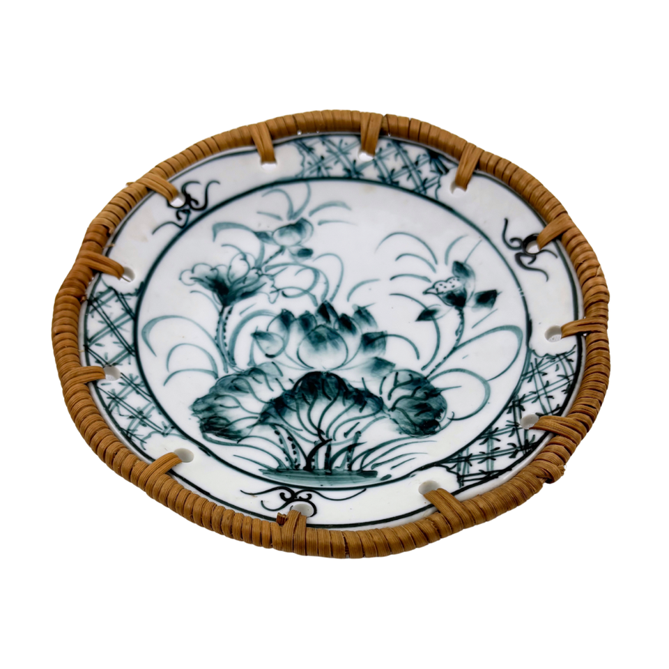 Assiette en céramique faite à la main motif lotus vert plat de service décoratif en rotin tissé écologique pour les fêtes de cuisine