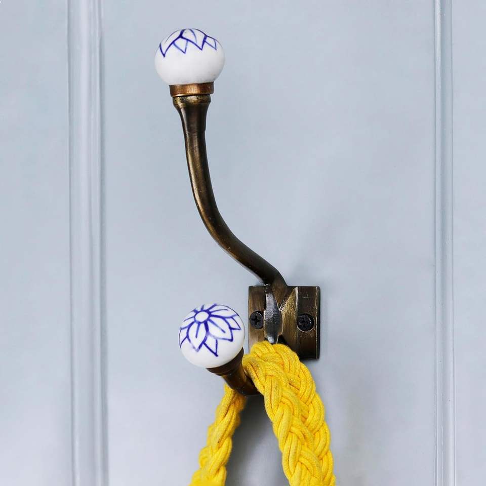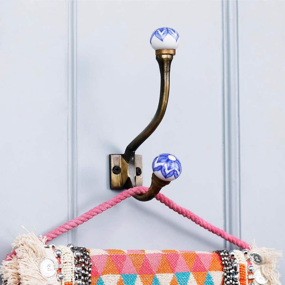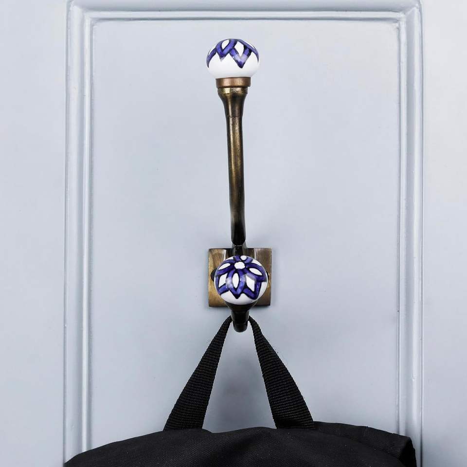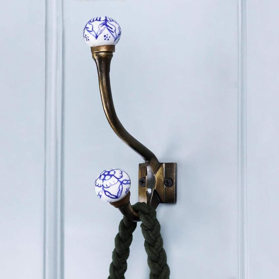 Crochets muraux en céramique faits à la main, motif bleu, double patère décorative, crochets muraux robustes, vente en gros