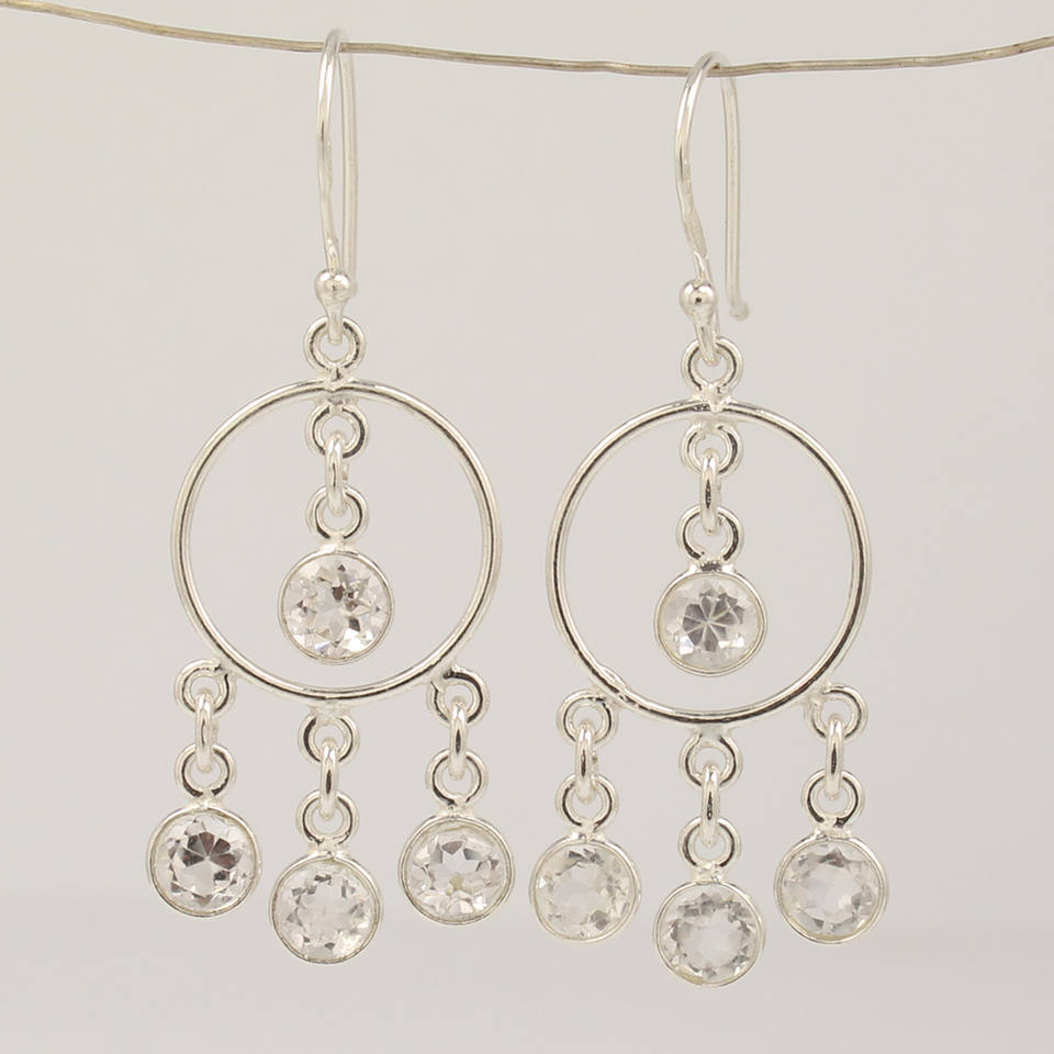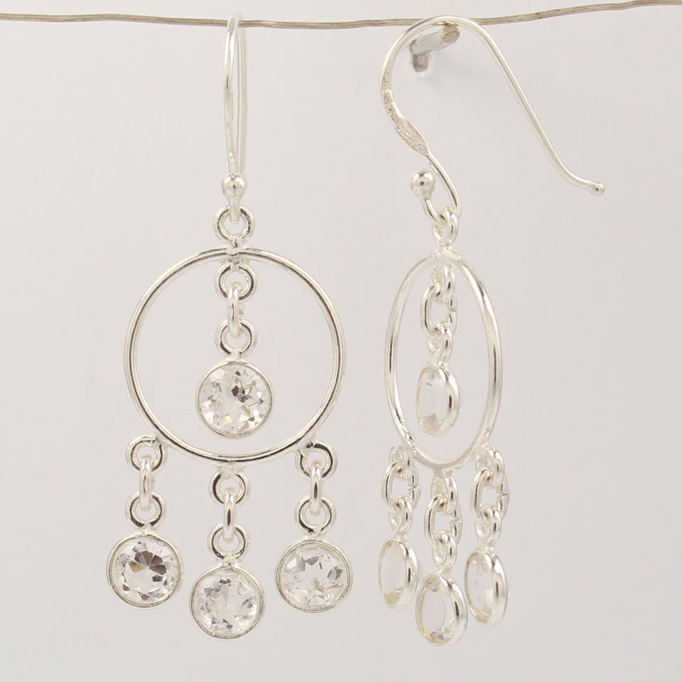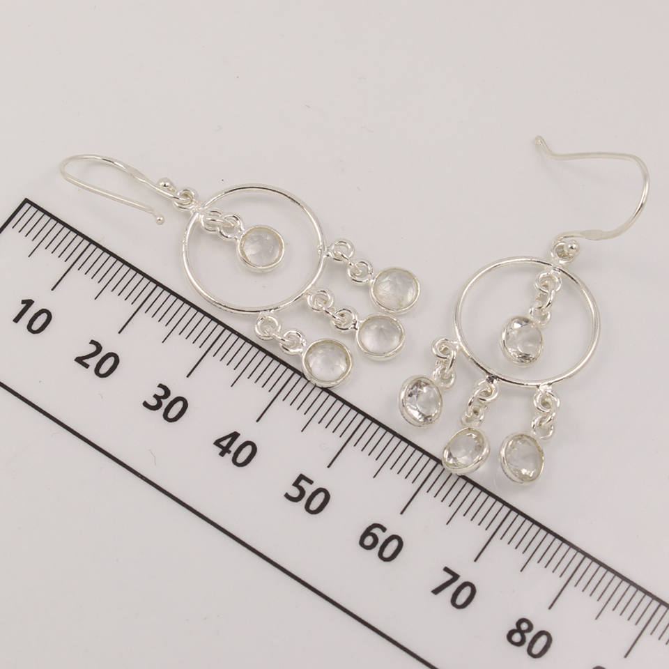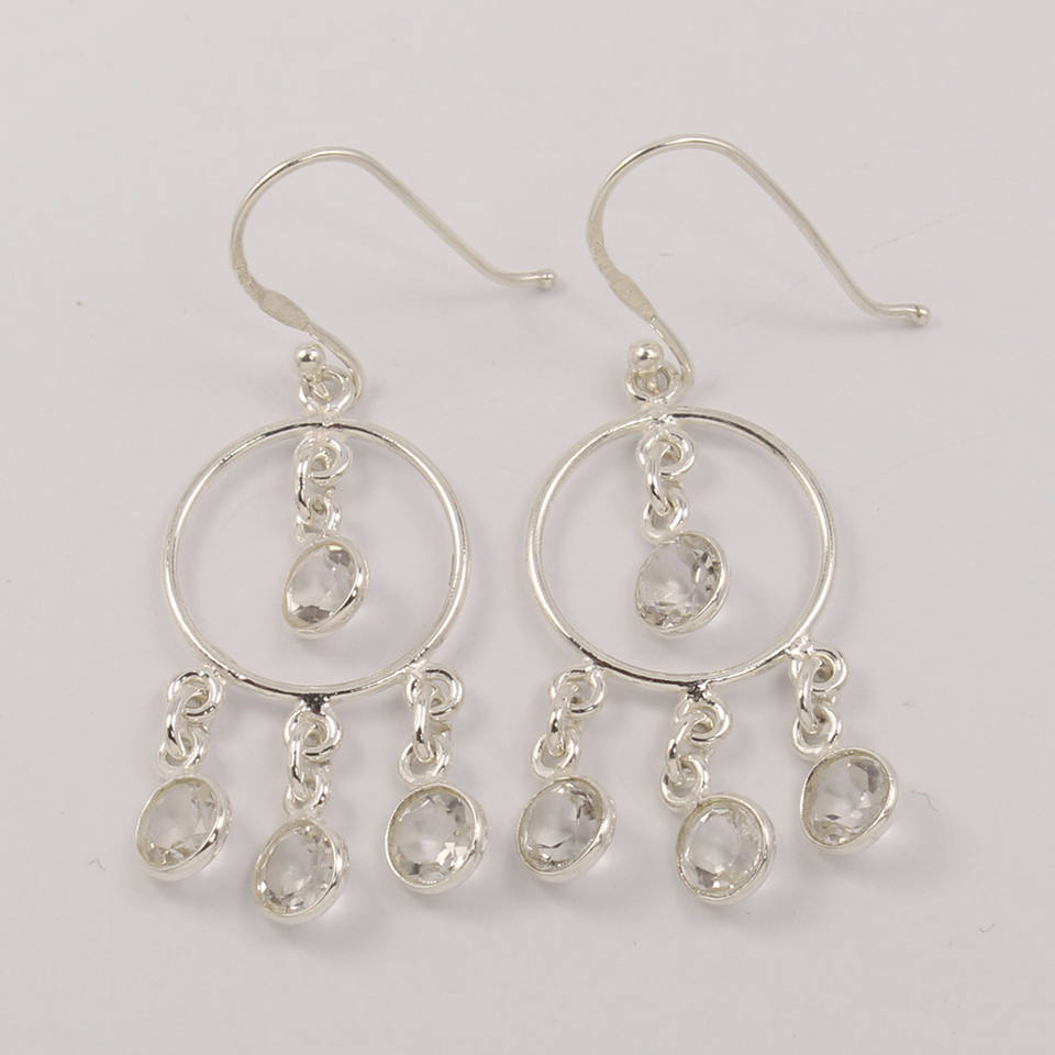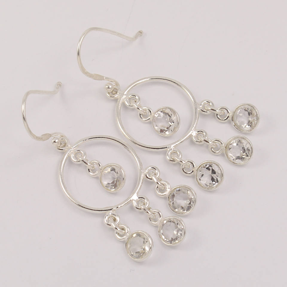 Boucles d'oreilles chandelier faites à la main en cristal clair Quartz rond brillant pierres taillées Boucles d'oreilles en argent sterling 925