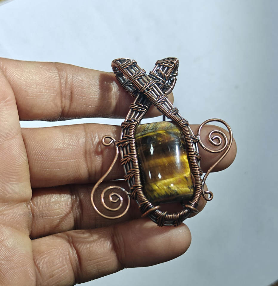 Pendentif œil de tigre en alliage fait main, enroulé de fil, pierre précieuse œil de tigre doré naturel, bijoux artisanaux classiques pour enfants