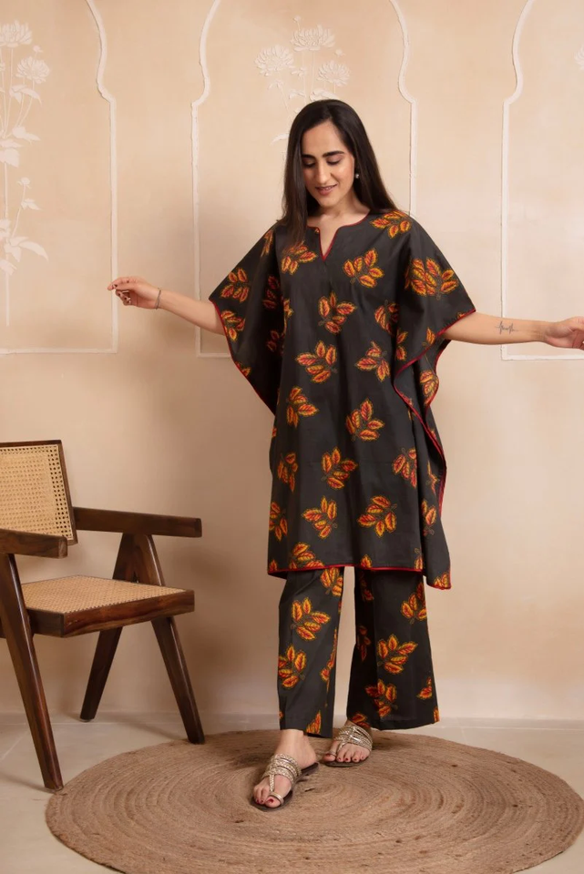 Ensemble Kaftan et pantalon en coton imprimé à la main, motif floral respirant, longueur au sol, ensemble coordonné, cadeau pour elle