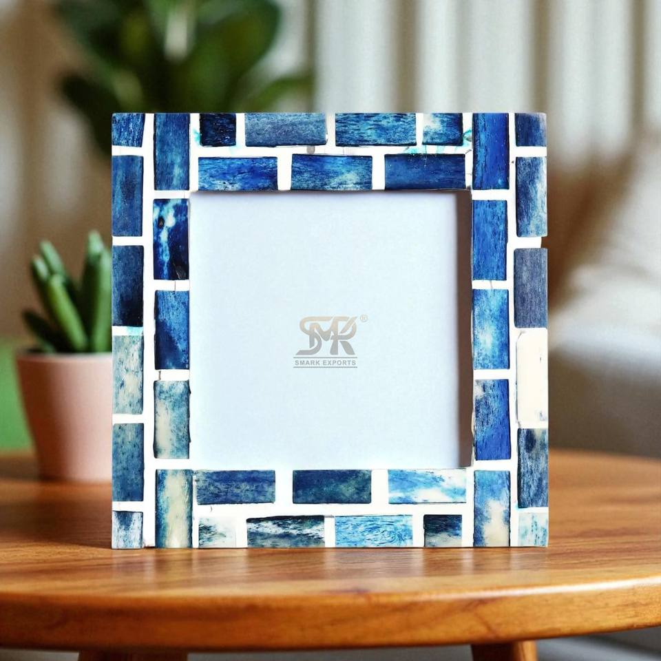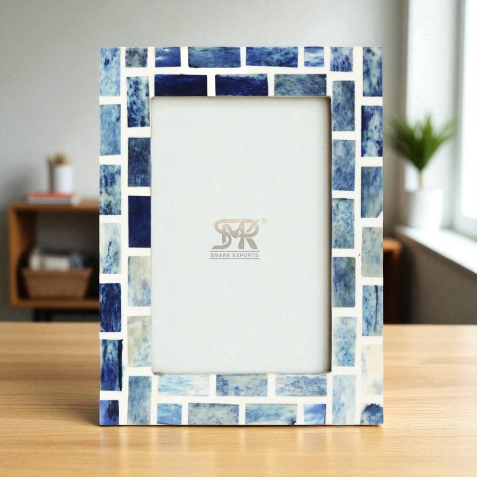 Cadre photo artisanal en os bleu incrusté, option de montage mural/sur table, personnalisable, décoration pour la maison ou le bureau, idéal comme cadeau