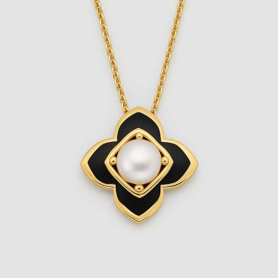 Pendentif fleur en or jaune massif 14 ct personnalisé fait à la main serti de lunette avec perle plaquée rhodium en émail noir cadeau de mariage