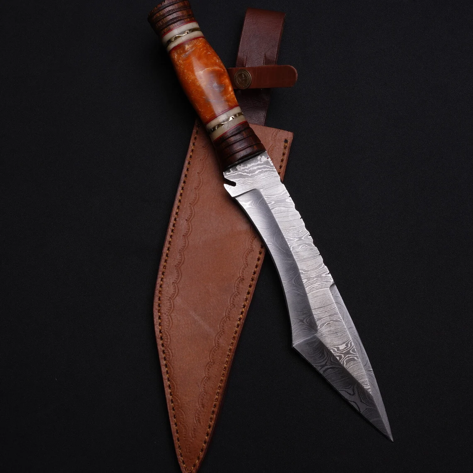 Couteau Bowie de chasse à lame en acier damas personnalisé fait à la main avec manche en bois de traversin en laiton en acier D2 pour le soutien OEM de combat