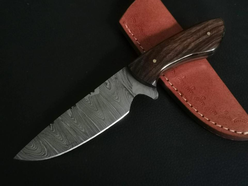 Couteau de chasse Skinner en acier damas fait à la main personnalisé avec manche en bois de rose et belle gaine en cuir supportée OEM
