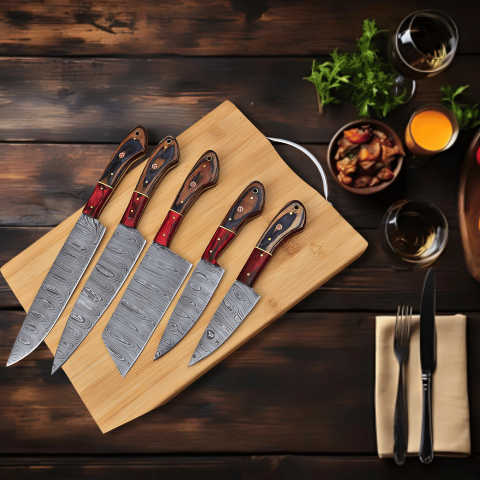 Ensemble de couteaux de chef en acier Damas écologique durable fait à la main, 5 pièces avec étui en cuir, fabriqué au Pakistan