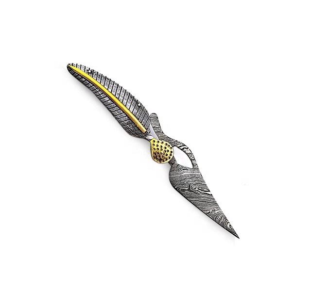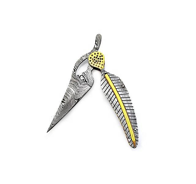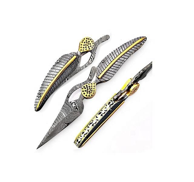Couteau pliant fait à la main en acier damassé complet personnalisé en forme de feuille combinaison en laiton gaine en cuir fin couteau utilitaire-vente chaude