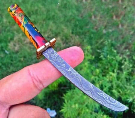 Mini couteau de chef japonais fait à la main en acier damas personnalisé de haute qualité en acier inoxydable forgé bois résine feuille poignée cuir