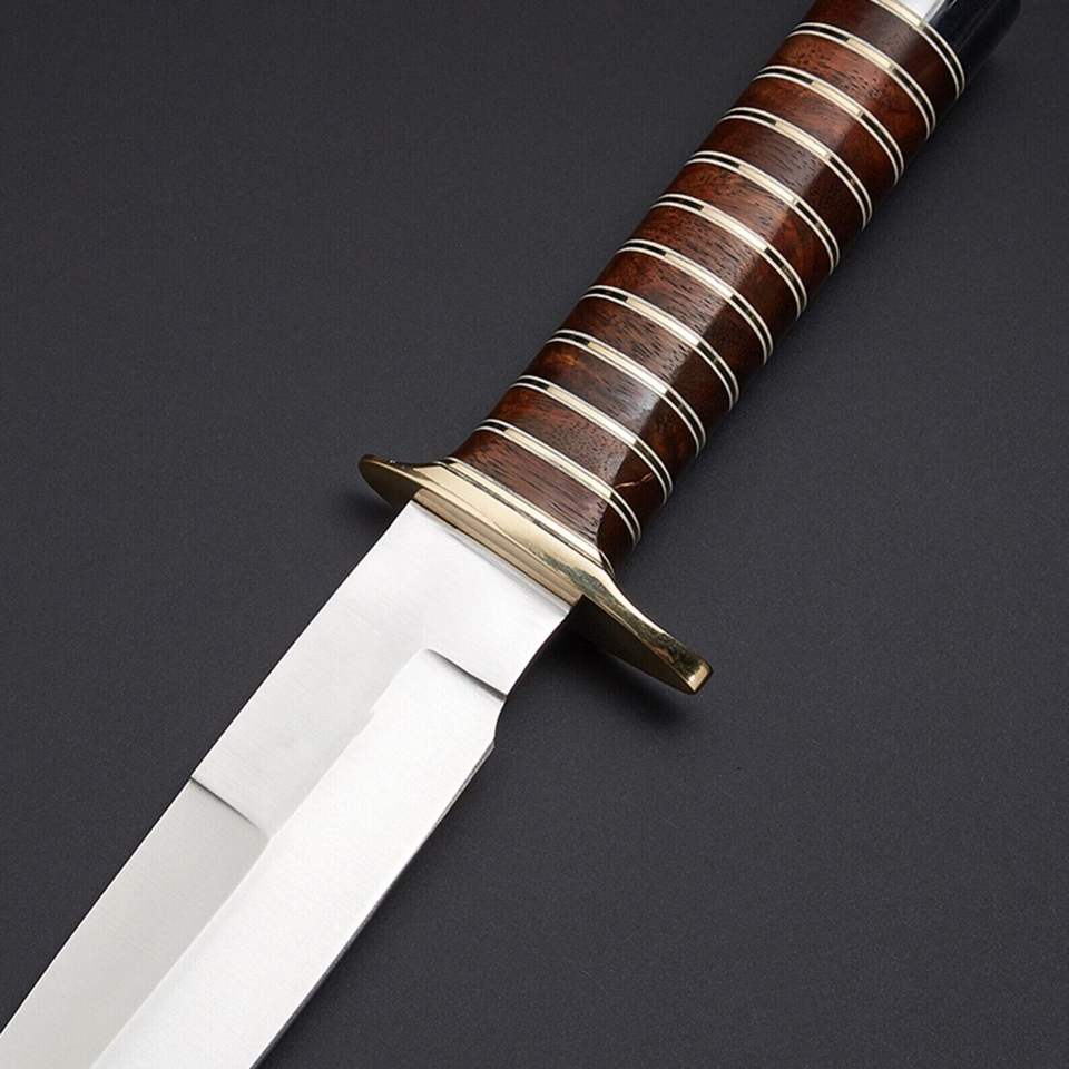 Couteau de chasse et de camping artisanal en acier D2, manche en bois, lame coulissante, garde en acier pour la survie en plein air, 11 pouces, cuir