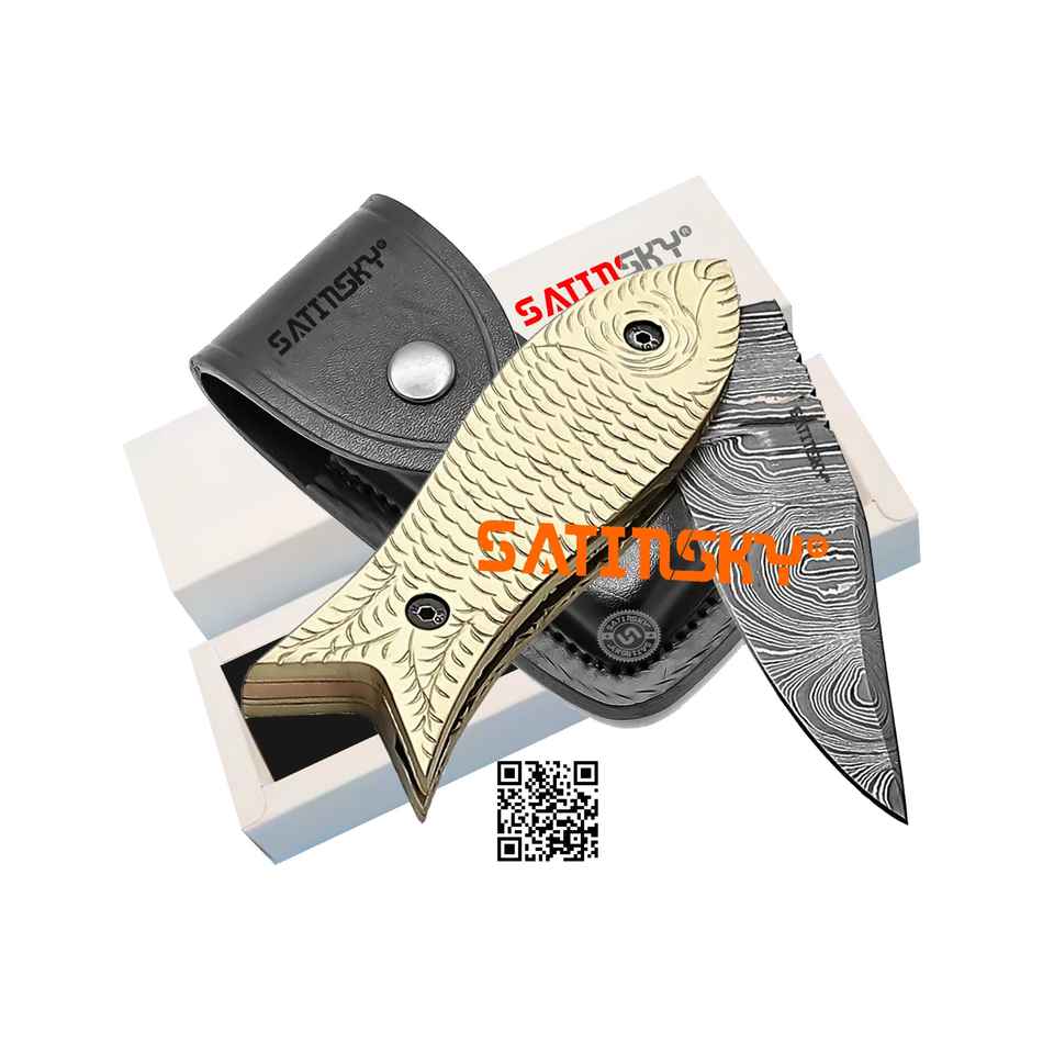 Couteau de poche damas fait main en forme de poisson 7.5 "manche gaine