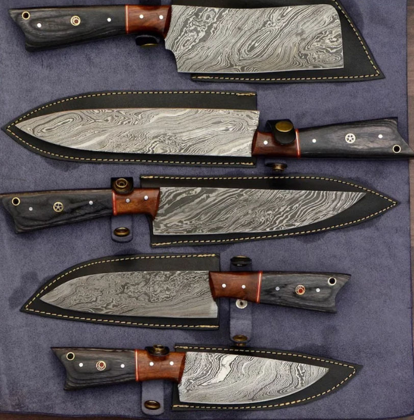 Ensemble de couteaux de cuisine 5 pièces en acier damas fait à la main avec gaine en cuir pur comprenant un couteau à fruits à steak de pain de chef