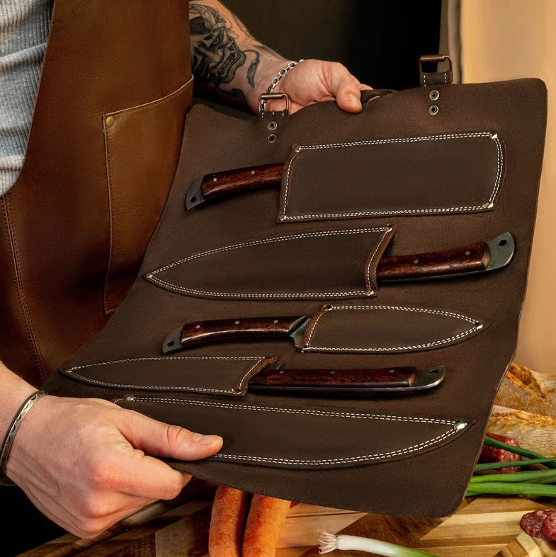 Ensemble de cuisine écologique 5 pièces en acier au carbone damas fait à la main gaine en cuir pur comprenant l'utilitaire de steak de couperet de chef