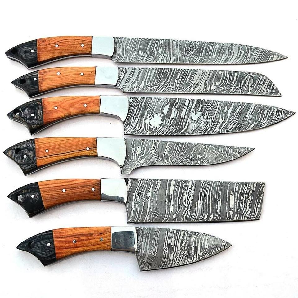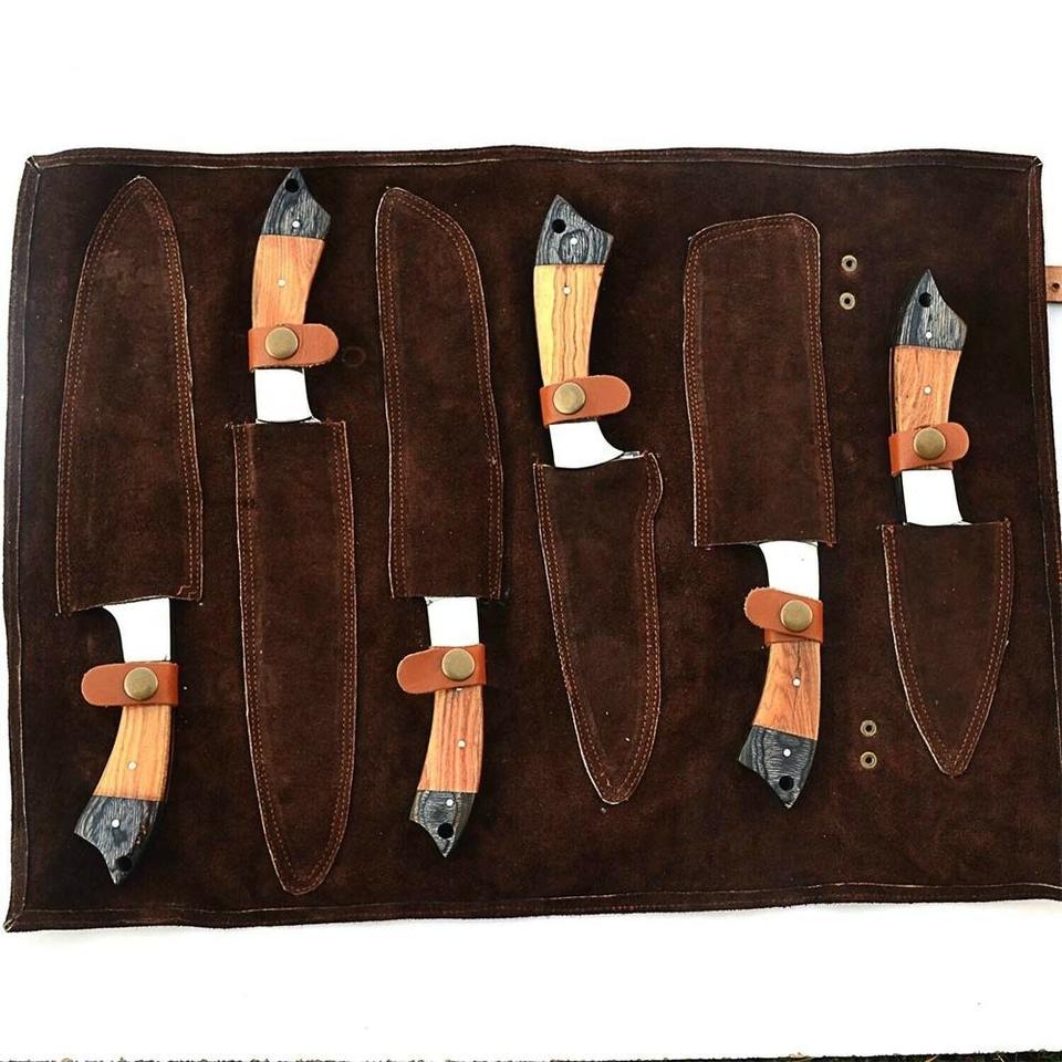 Ensemble de couteaux de chef en acier Damas fait main, 6 pièces, manche en bois avec étui en cuir véritable, ensemble de couteaux de cuisine