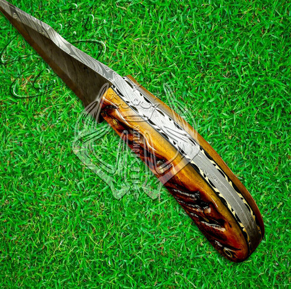 Handmade Damascus Steel Skinning Knife Fixed Blade Hunting Camping Leather Sheath Ram Horn Handle Customizable OEM Gift for Him