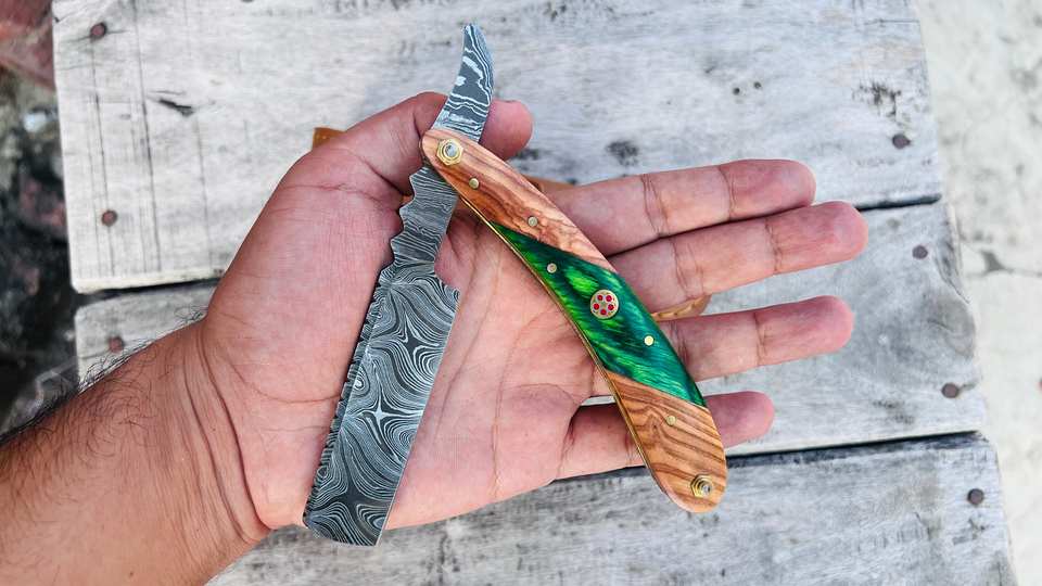 Rasoir droit en acier damassé fait à la main couteau de barbier classique manche en bois personnalisable Option OEM parfaite pour les couteaux de garçon d'honneur