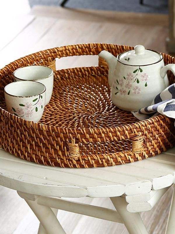 Plateau de service en jute de rotin décoratif fait à la main avec finition en incrustation d'os Ensemble de 3 plateaux de serveur de nourriture de forme arrondie