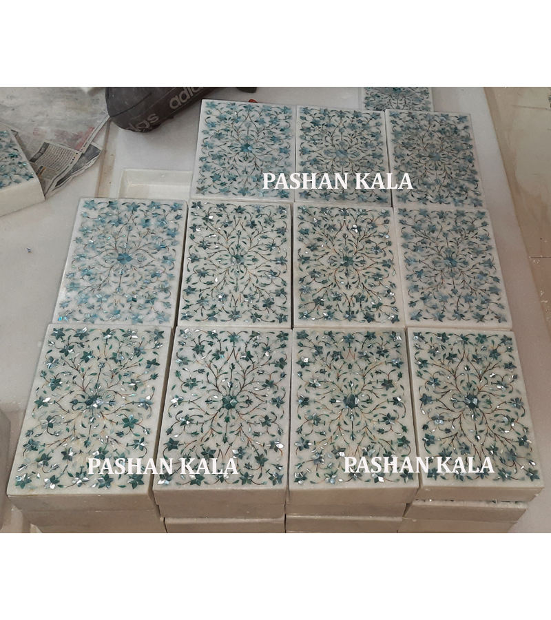 Boîte à bijoux en marbre blanc incrustation de nacre, design fait main, forme rectangulaire, couleur vert clair, utilisée pour la décoration intérieure et les cadeaux.