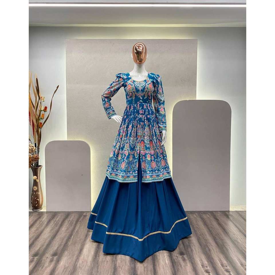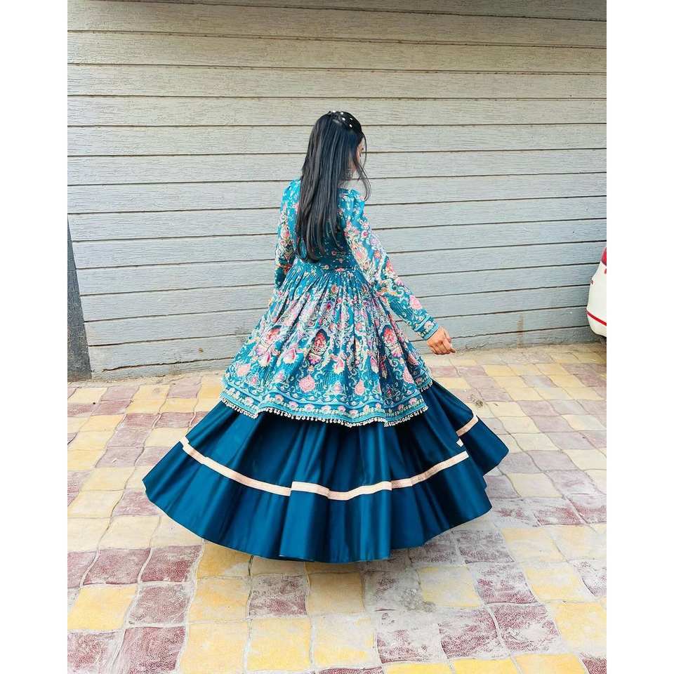 Lehenga artisanal de créateur coupe trapèze avec un magnifique imprimé floral, taille empire et haut en organza brodé