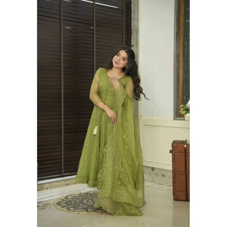 Ensemble haut-bas et dupatta de soirée, fait main, de créateur, en organza brodé, coupe A-line, taille empire