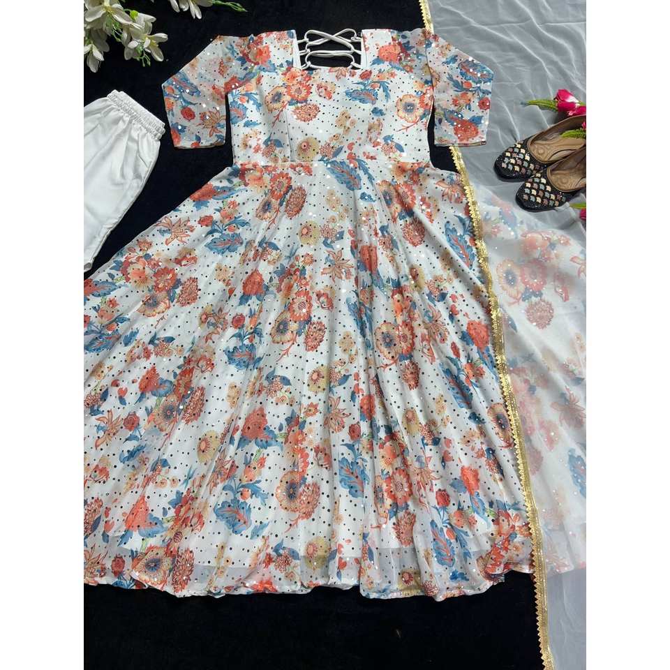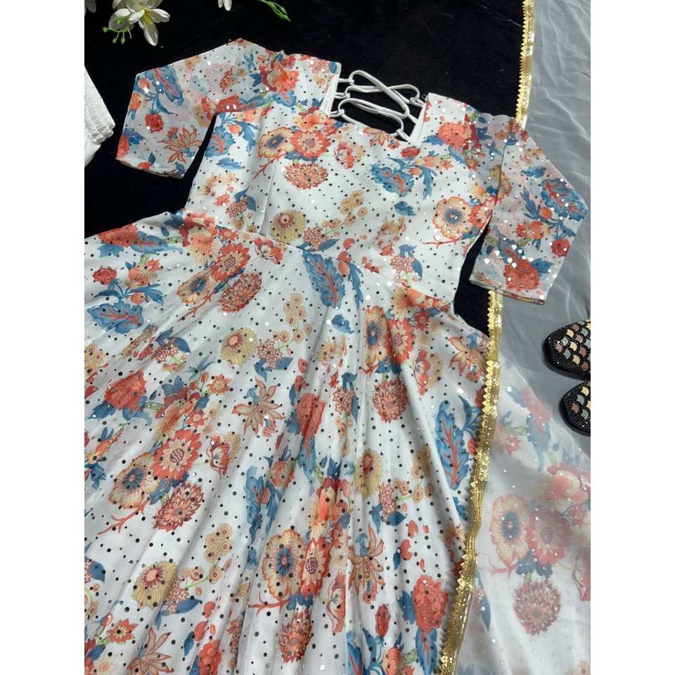 Robe Anarkali de créateur faite à la main, tenue de soirée avec imprimé floral, nouveau style fantaisie coupe trapèze, taille empire, en tissu organza