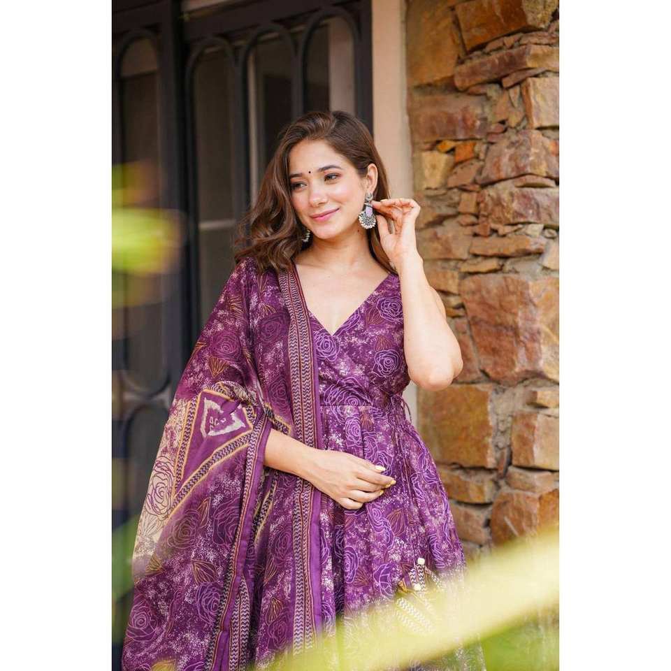 Robe Anarkali de créateur faite à la main avec bas et dupatta, silhouette trapèze, taille empire, en tissu organza, idéale pour les soirées