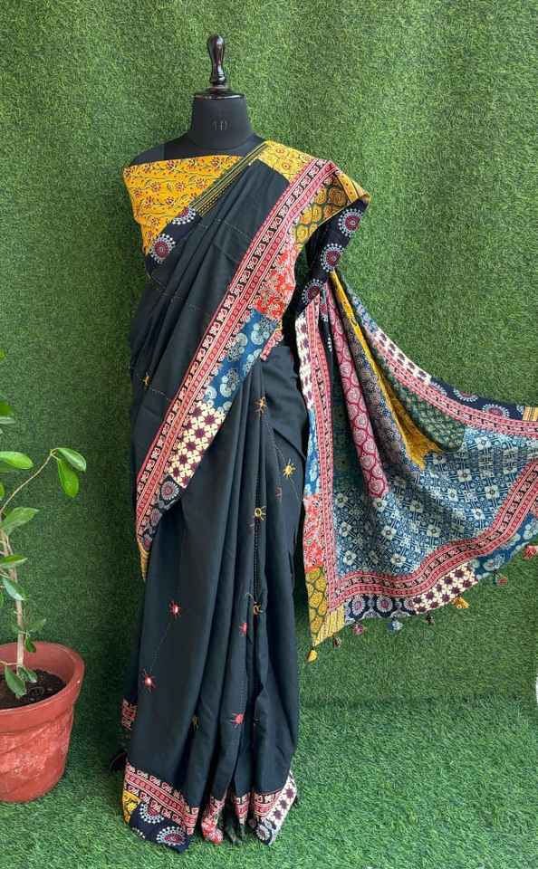 Handmade Designer Cotton Saree with Patch and Mirror Work Indian & Pakistani Clothing with Stylish Tassels