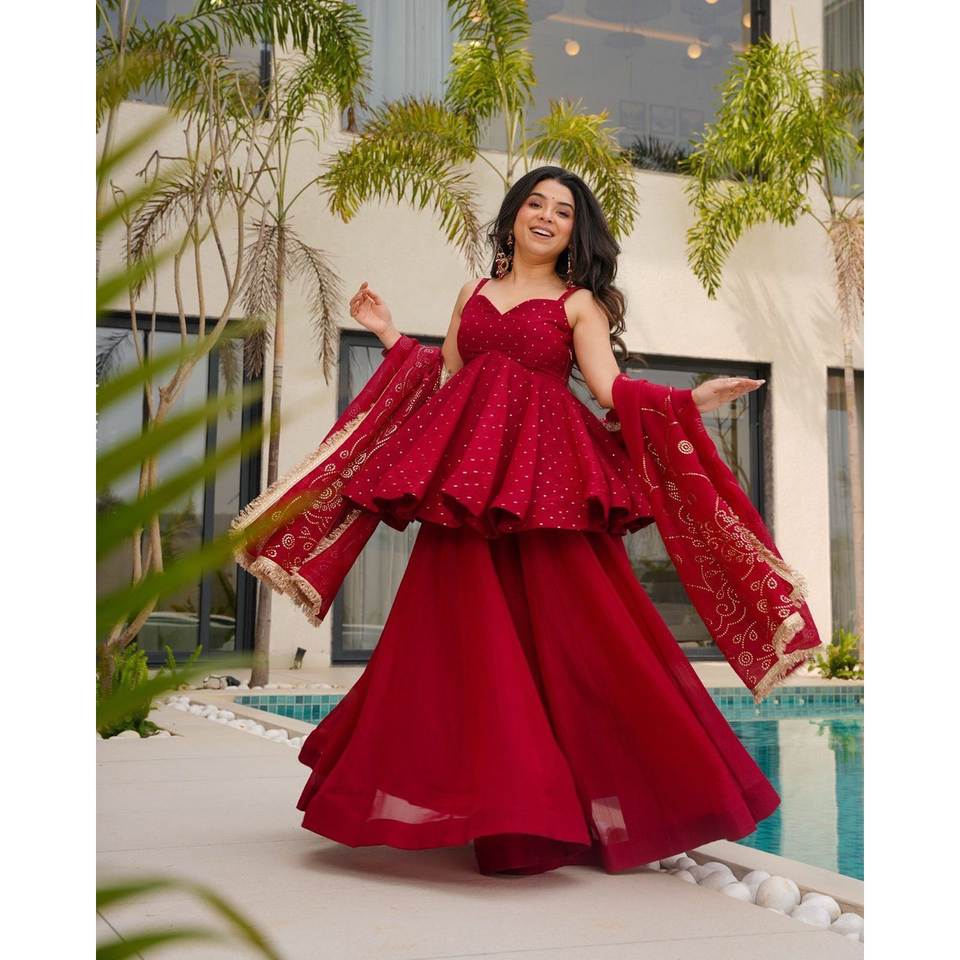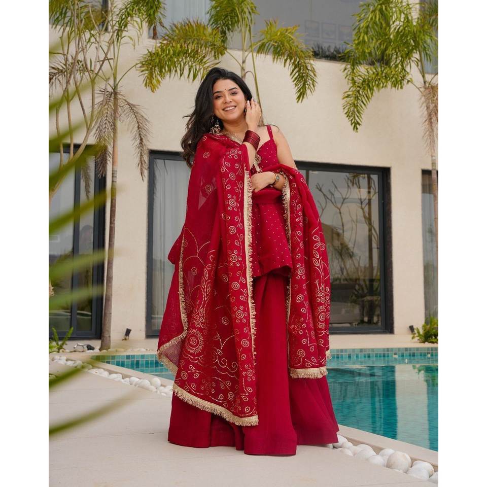 Ensemble haut-bas et dupatta de créateur fait main pour soirée, taille empire, taille XL, en tissu organza