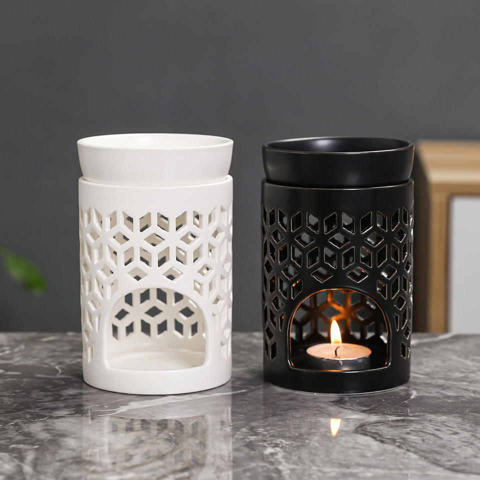 Support de bougie chauffe-plat en céramique blanche écologique fait main avec pot à bougie en porcelaine noire ajourée pour diffuseur d'huiles essentielles