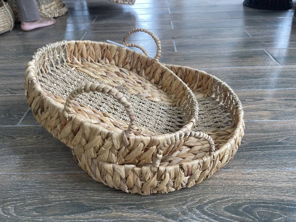 Plateau rond en jacinthe d'eau tissé à la main, écologique, avec poignées, OEM ODM, vente en gros, décoration et rangement rustique pour la maison, Vietnam